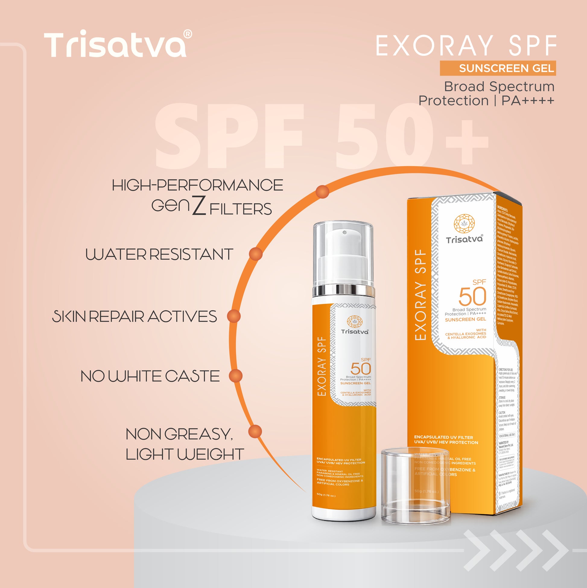 THE FUTURE OF SUN PROTECTION IS HERE Stop choosing between a sunscreen and a treatment. TRISATVA EXORAY is a next generation Smart Shield designed for modern life. We combined advanced biotechnology with high performance protection to create a Sunscreen Face Gel Cream that does what others cannot: Protect, Repair, and Glow. WHY EXORAY IS DIFFERENT: Most sunscreens only block UV rays. Exoray uses New Gen Z Filters; advanced photostable shields that do not break down under sunlight, giving you longer lasting protection. Plus, we added a Full Spectrum Block to defend against Blue Light (from your phone/laptop) and Infrared Light (heat radiation). POWERED BY EXOSOMES: This is not just SPF; it is skincare. Enriched with Exosomes, our formula penetrates deep to signal cellular repair, helping to reverse sun damage, calm inflammation, and strengthen your skin barrier while you go about your day. 4 LEVEL DEFENSE SYSTEM: UVB/UVA: SPF 50 PA++++ blocks burning and aging rays. VISIBLE LIGHT: Blocks Blue Light from digital screens. INFRARED: Neutralizes heat induced skin stress. POLLUTION: Creates a breathable shield against dust and smoke. DESIGNED FOR REAL LIFE: Water Resistant: Stays effective through sweat and swim sessions. Zero White Cast: Invisible on all skin tones. Matte Finish: Controls oil without drying out your skin. HOW TO USE: Apply liberally to face and neck 15 minutes before sun exposure. Reapply after swimming or heavy sweating.