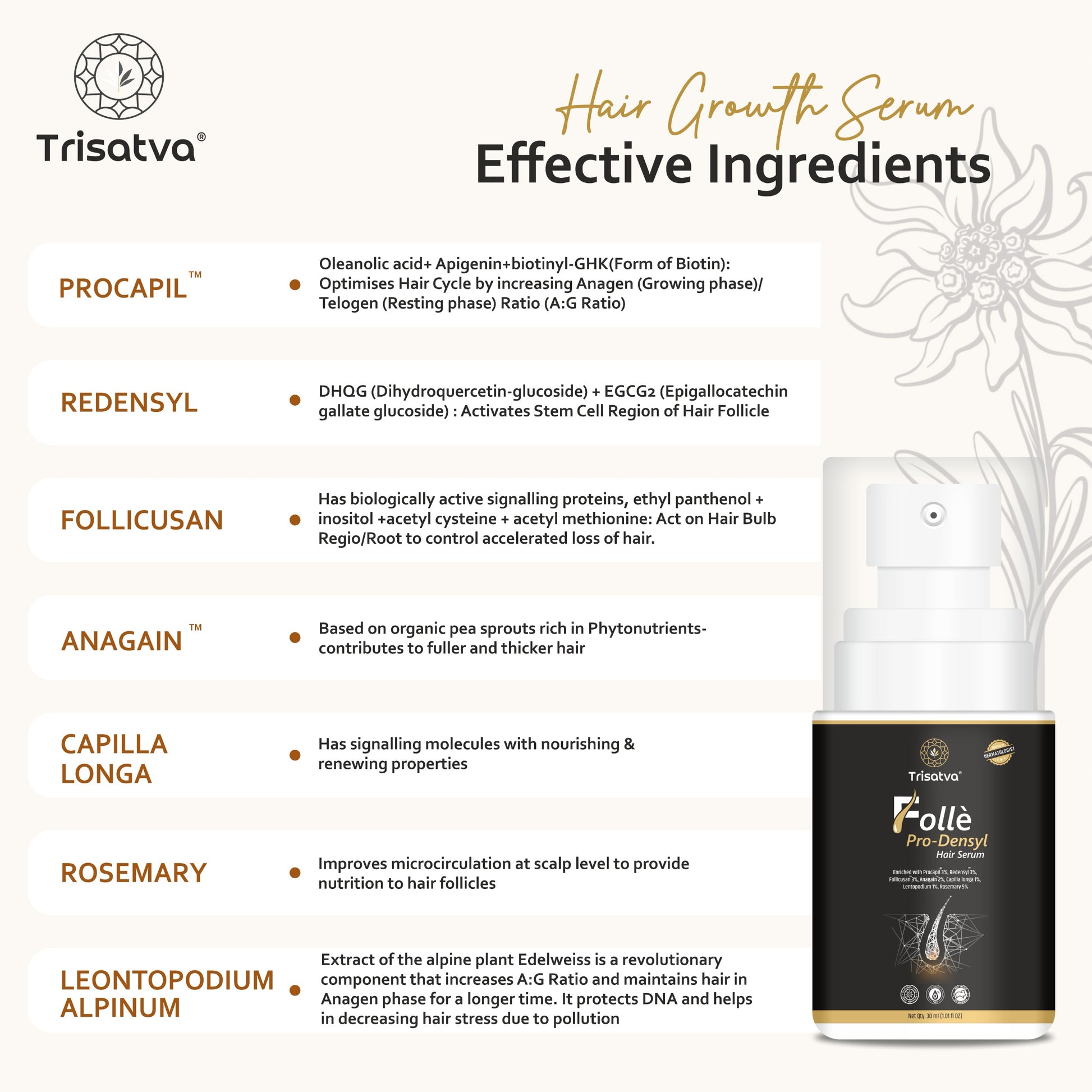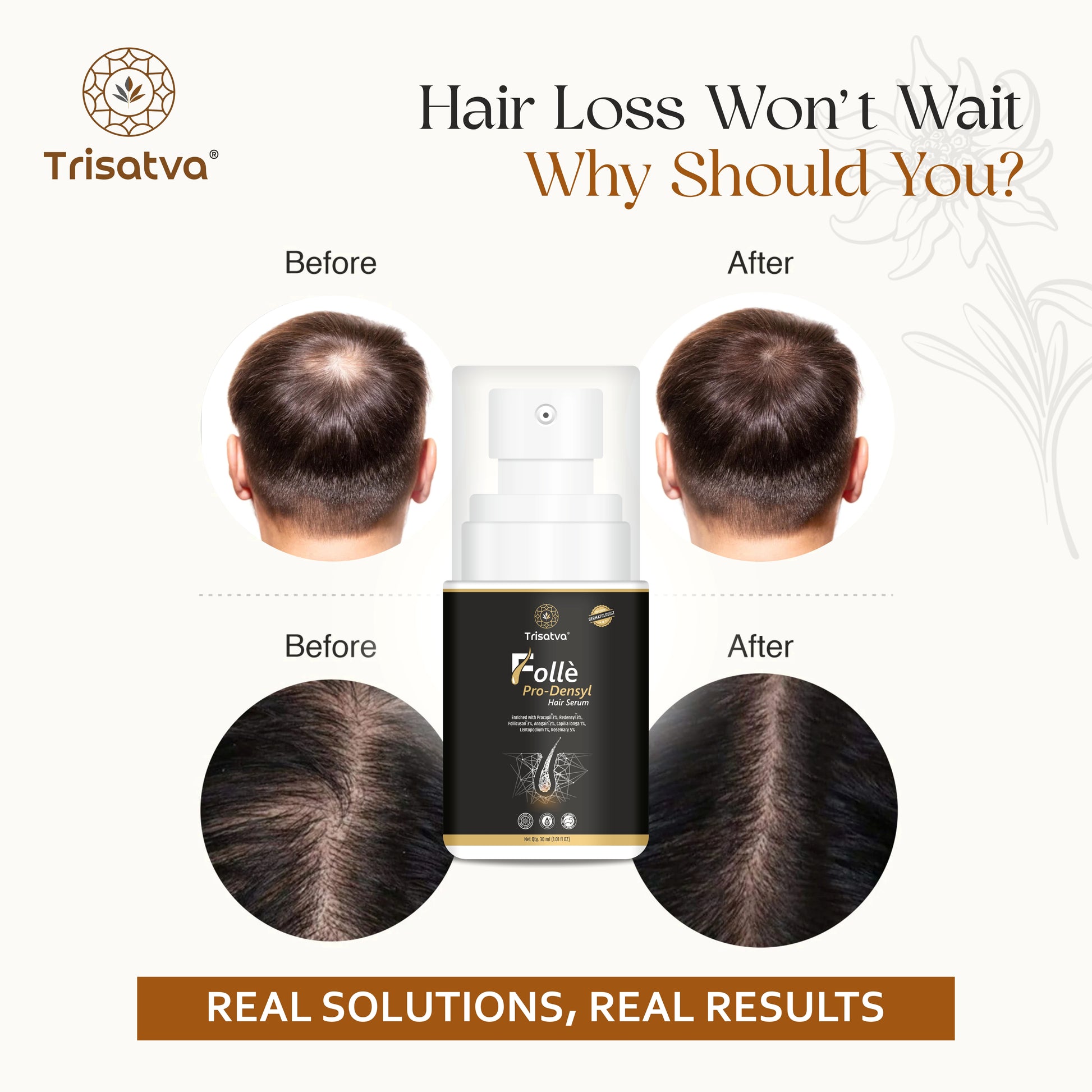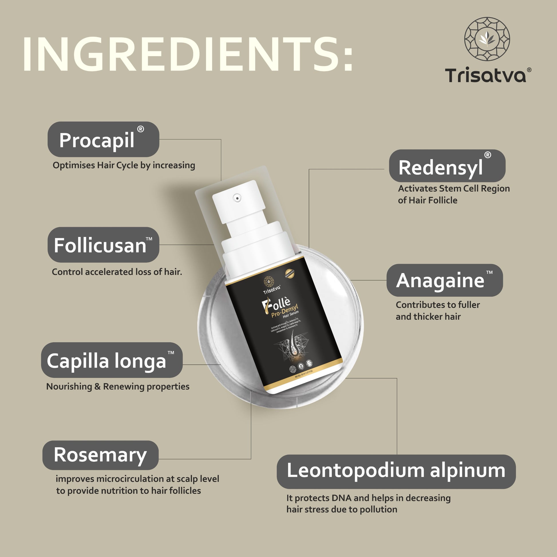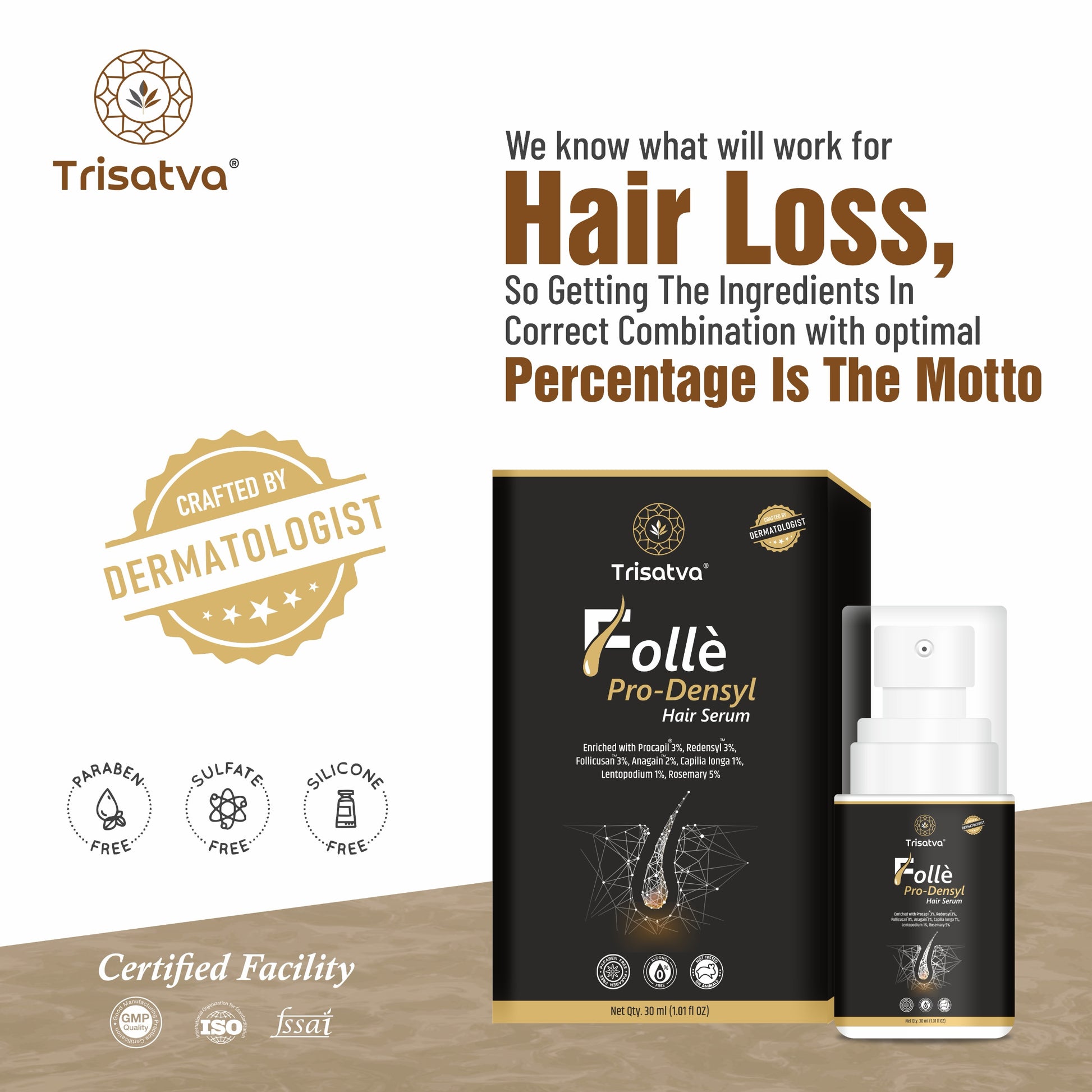 Tired of hair fall? Trisatva Folle Pro-Densyl Hair Serum is your revolutionary, dermatologist-crafted solution to combat hair loss and stimulate robust hair growth, because getting the ingredients in the correct combination with optimal percentages is the motto.