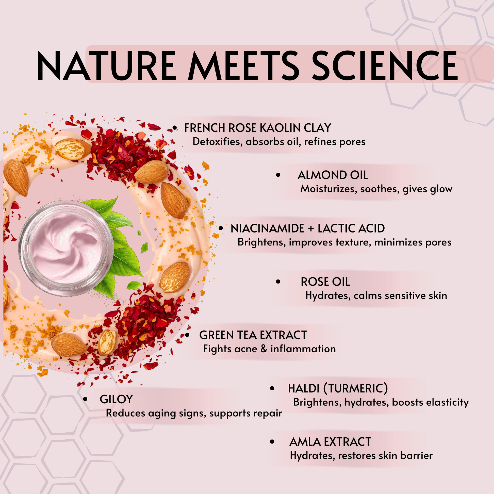 Experience the power of nature and science with the Trisatva French Rose Kaolin Clay Mask ,a luxurious, multi-benefit face mask designed to detoxify, hydrate, and brighten your skin.